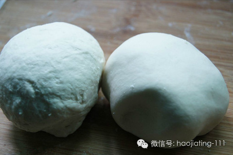 左边的那块就是用普通的凉水加一点点盐和出来的,右边很光滑的那块是用热盐水和出来的,最后再把两块面揉到一起就可以了。