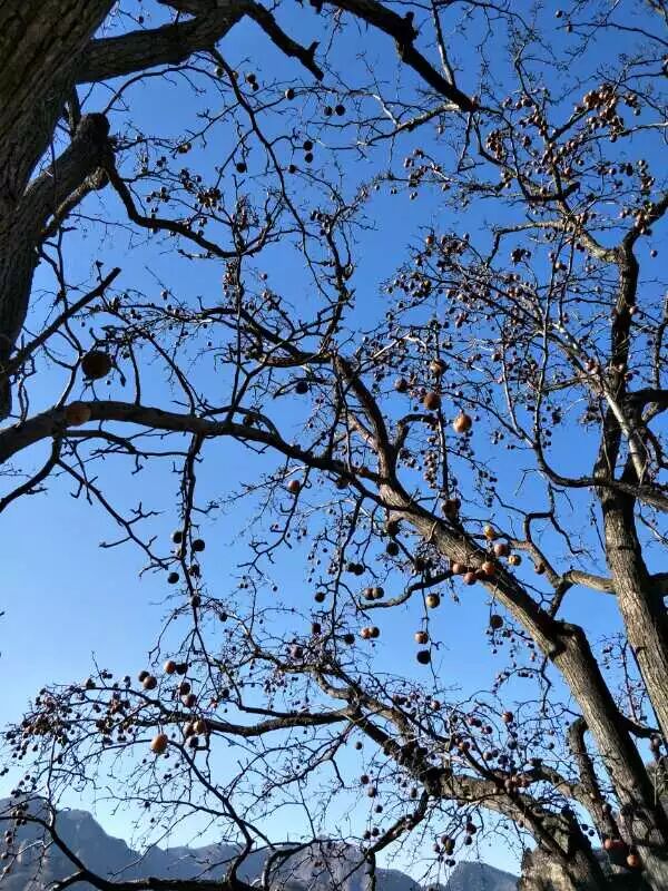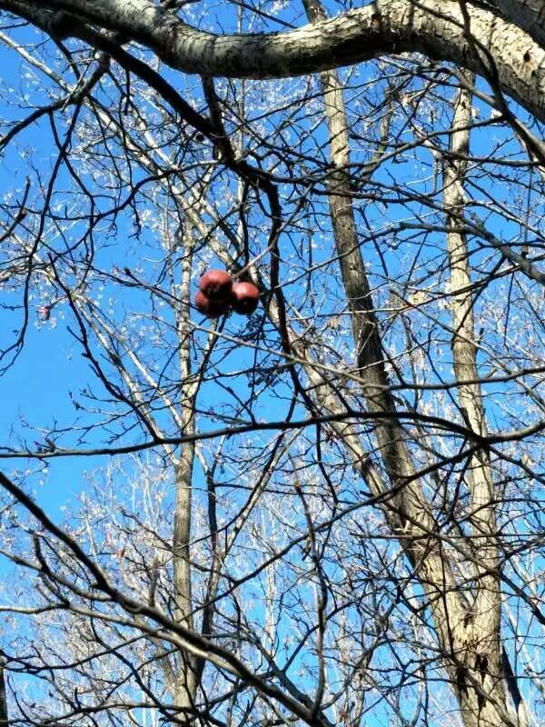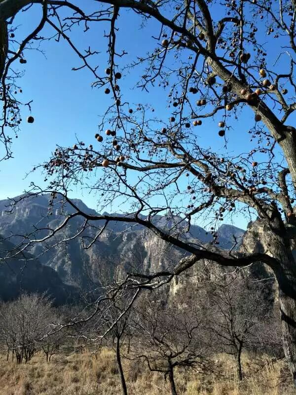 吃过饭后,一路的爬升,算是到了今天的第一个崖口,因为过了这里就是一段下坡了,毕竟这么长的路,看见下坡心里还是蛮兴奋的。遇见冻梨,那就更激动了,满树挂的都是梨,不过颜色已经不是9-10月分的颜色了,那时候应该是青绿色,后者黄的吧,如今的颜色看起来倒是像深棕色,枯黄色,味道,哈哈哈,反正我吃了几个,感觉真的是精华都被大自然吸收了,食之无味,弃之可惜,估计就是这么个心理吧!!!!