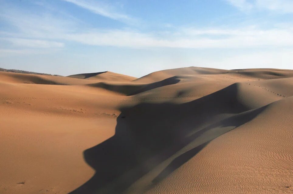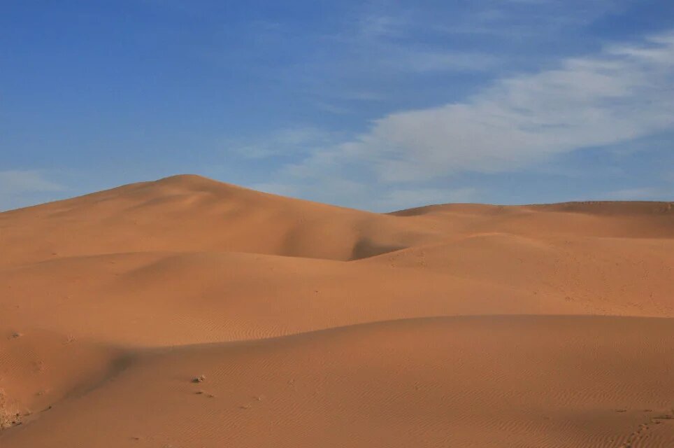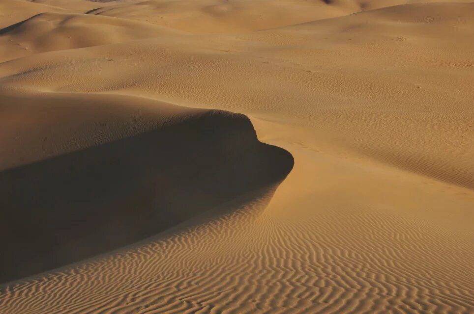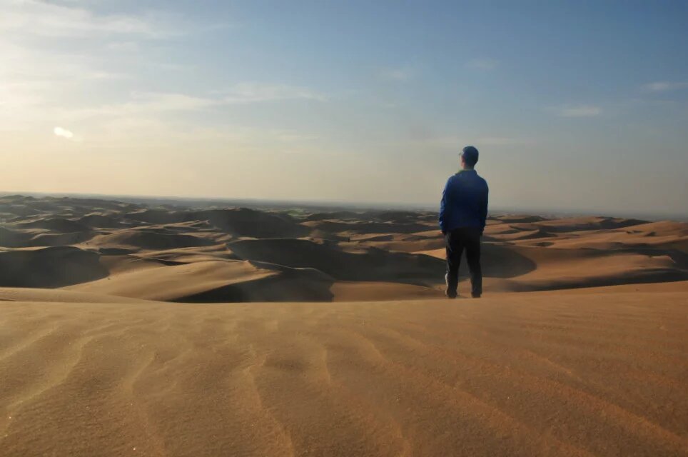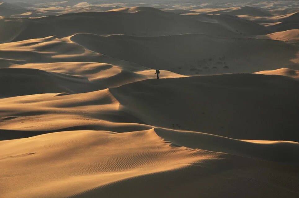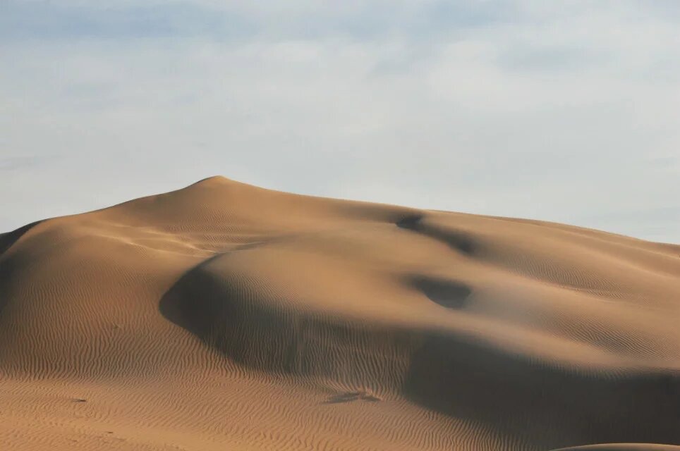 阳光开始西斜,不再那么刺眼,温度也开始逐步降低。风变得大了些,经常扬起沙子骚扰我的躯体。穿过这片人工绿地后很快便到了景区,便不再着急赶路,开始寻找优美曲线的沙丘。那轻柔的曲线多少次让我蹲下去抚摸,如同美人横卧的酮体。沙丘上还有无数波浪般的小曲线,这是风的杰作。它既能创造出大的沙丘,也能刻画出细致的波纹。在大的曲线上呈现着无数的小曲线。阳光开始让沙子泛黄,忘了羽绒服的我守在一个沙丘的顶端等候落日,瑟瑟发抖。沙漠的曲线随着阳光的西斜,成为阴阳的分界线,阳面的沙闪着金光,金灿灿的。远处的驴友穿行在沙丘的脊线上,上上下下,这是一个日落的音符。远处有一堆人一部分人在阳面里,一部分人在阴面中,相隔着却相连着。日落的时候总感觉太快,黄色变换总让人琢磨不透。朝西方朝拜,愿在西方极乐的人们能获得幸福,清明时节,愿逝去的亲人们安详,佑我们再生之人健康幸福。