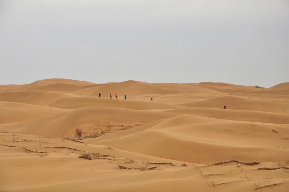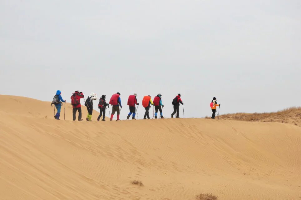 库布齐沙漠,中国第七大沙漠。位于内蒙,在阴山山脉与黄河间的狭长地带。响沙湾是中国四大鸣沙山之一,据说走上去会轰隆隆的响。一下班便匆匆背上行囊出发。需要坐一夜的大巴才能到达目的地,这对于我这类不好睡觉的人完全是折磨。一夜几乎没合过眼,便到了天明。十点多,一行人才到达徒步的起点,开始第一天适应性行走,。沙漠外延种植了不少防护林,挡住向外扩张的沙地。天空阴沉沉的,本来天气预报说有暴雪,结果下在了银川以及包头北面。穿过一片人工培植的干枯草地,步入沙漠中。没了阳光的渲染,沙显得苍白无力。虽然沙丘也有起伏,但终归在边缘地带,眼里少不了几处房屋,避不开高大的电线杆,没有大漠苍茫之感,只觉得走上了一片沙地,难免有些无趣。兴致乏味的陪着大家走着。磨蹭到一天的结束,与一个叫臭蛋的伙伴抱怨着,无奈着。