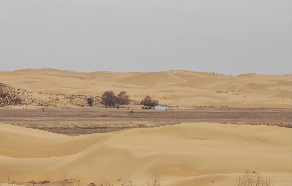 黄沙漫漫,看不到尽头,一步不退的逼近河谷,在两侧虎视眈眈。随着队伍别了河流,往响沙湾景区方向而去。陷入无尽的荒漠里。漫天黄沙飞卷,波波相济,滚滚而来,一浪越过一浪,汹涌着,似要气吞万里。一阵风过,沙浪敲打着我们的躯体,还试图侵入。艳阳高照,虽是清明时节,已能感受到酷暑。嘴唇有些干裂,想那年七月在敦煌四人用一只唇膏的场景,一张张被撕裂的嘴唇,站不了一分钟便滚烫的沙地,回忆有太多美好,总在相同的场景下被记起。不断的补充水分,来缓解嘴唇的干裂,汗水已经沁透衣衫,继续一个山丘接一个沙丘的上上下下。鞋无数次被黄沙吞没,黄沙已经占据了我鞋内的空间,开始挤压我的脚不得不很多次的停下来清理。黑色的甲虫不时出现,快速的在沙地上爬行,也不明白她们在追寻个什么。前方有一片人工种植的树林,有一片新绿,其余的早已干枯,荒草颓萎的趴在地上,假如有一把火这一切都将不复存在。很奇怪,这里并没有水源,为何选择在这里种植树林防护。在这里休息了片刻,补充了一点食物,便又匆匆起步。